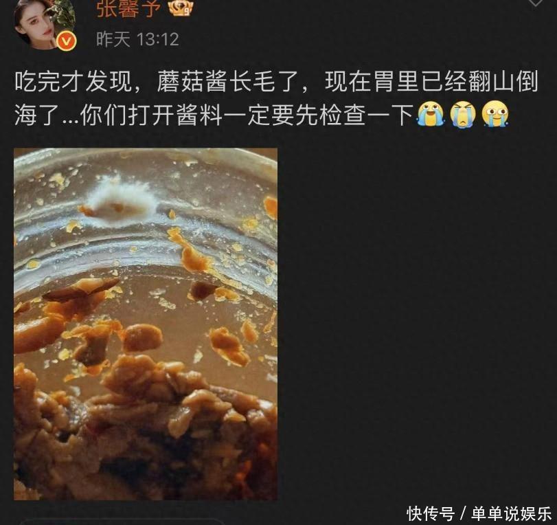 11月5日,演员张馨予在个人微博上面发了一条关于自己吃了发毛的酱料,导致胃有些不舒服的博文。